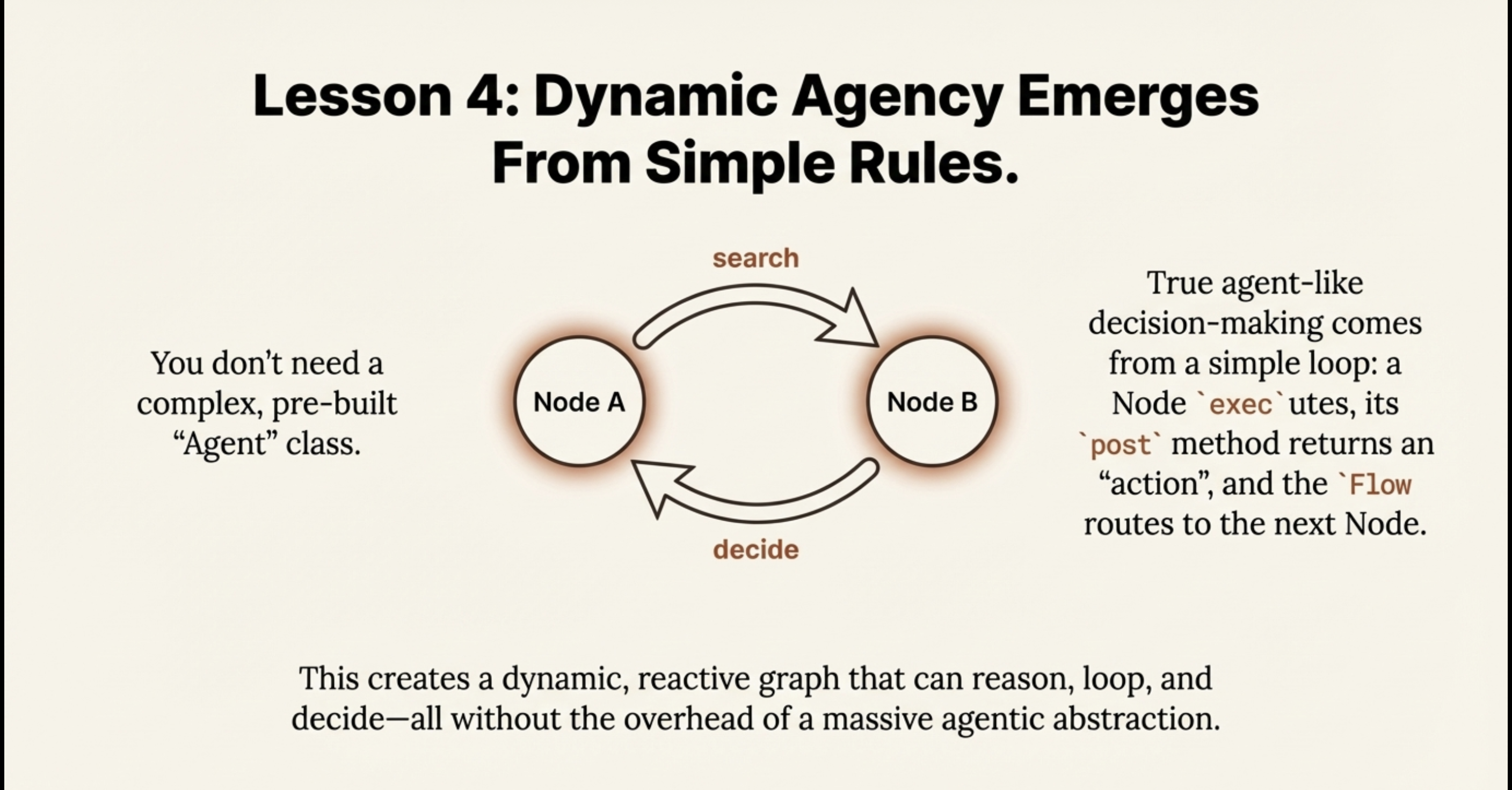 The final, and perhaps most important, lesson from Pocket Flow is a grounding principle against the hype of AI replacing developers. The âAgentic Codingâ methodology doesnât diminish the humanâs role; it elevates it. By offloading tedious implementation to AI agents, the developerâs primary responsibility shifts to where it matters most: system design.