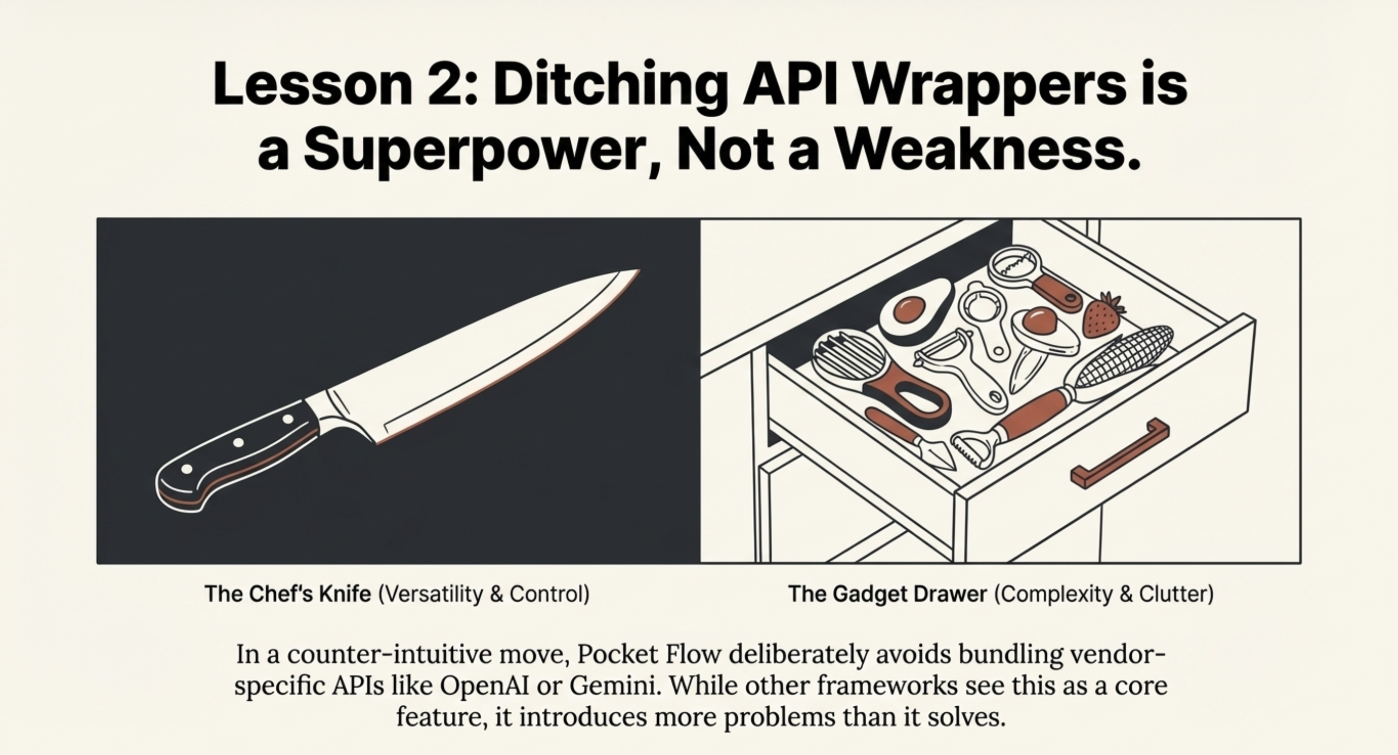 In a counter-intuitive move, Pocket Flow deliberately avoids bundling vendor-specific APIs like OpenAI or Gemini wrappers. While other frameworks see this as a core feature, Pocket Flow argues it introduces more problems than it solves. This is like choosing a versatile chefâs knife over a drawer full of single-purpose gadgets like an avocado slicer. The reasoning comes down to three key points: