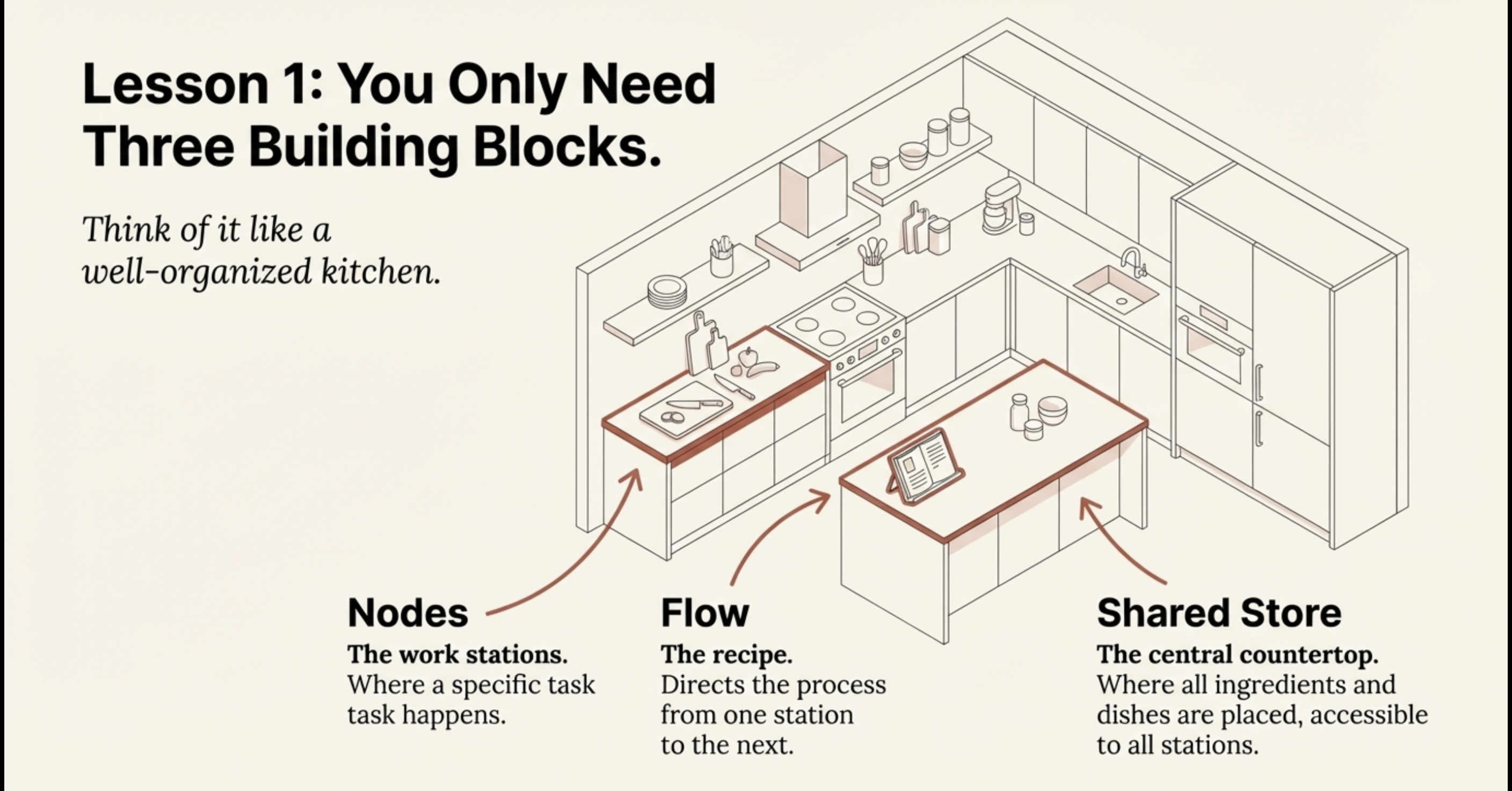 The core philosophy of Pocket Flow is that complex LLM systems are fundamentally just âsimple directed graphs.â Instead of building layer upon layer of abstraction, the framework provides three simple, powerful building blocks, much like a well-organized kitchen: